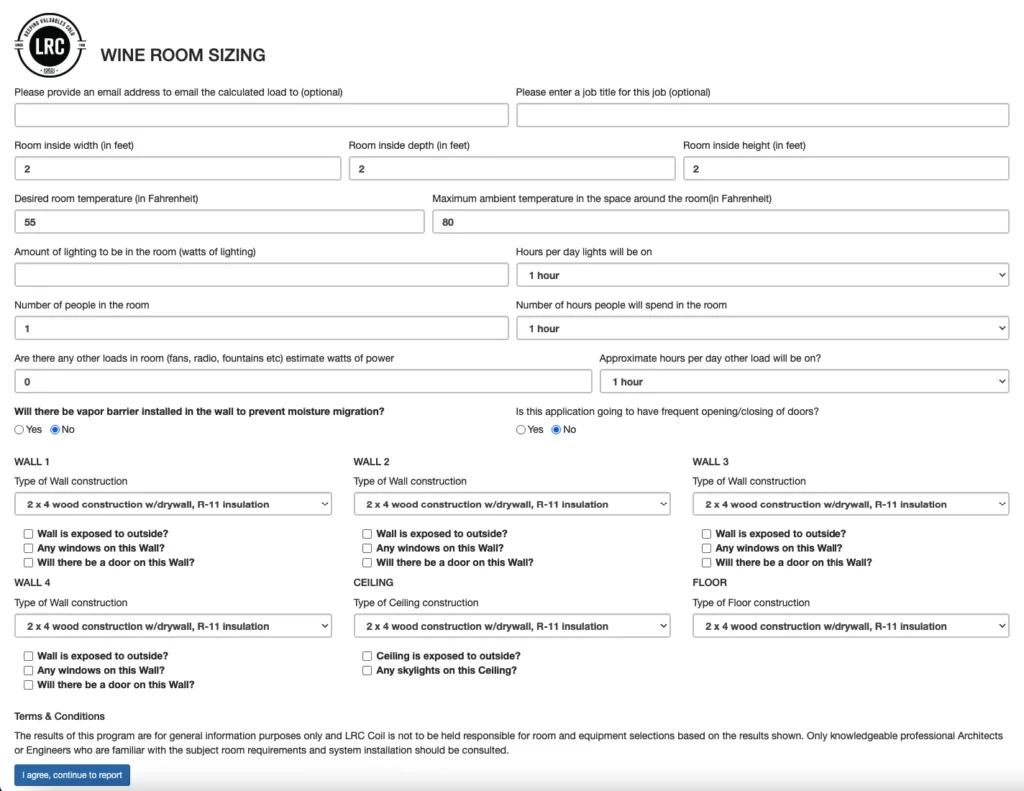 The Wine Room Sizing Calculator helps accurately estimate the cooling load required to maintain proper temperature and humidity in a wine room or cellar. By factoring in room dimensions, insulation, wall and ceiling construction, lighting, occupancy, door usage, and ambient conditions, this tool calculates the refrigeration needs to ensure optimal wine storage performance. The results help guide proper equipment selection, improving efficiency, reliability, and long-term temperature and humidity control.